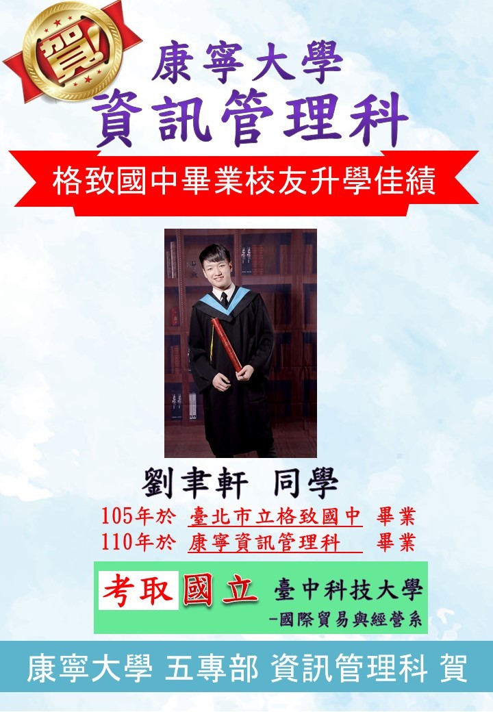 恭賀! 資管科110年畢業生 劉聿軒 錄取 國立臺中科技大學 國際貿易與經營系