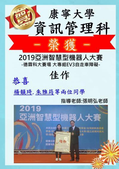 賀! 資訊管理科四年忠班朱雅筠等二位同學獲得2019亞洲智慧型機器人大賽 佳作