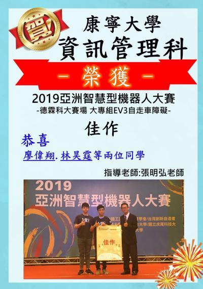 賀! 資訊管理科四年忠班林昊霆等二位同學獲得2019亞洲智慧型機器人大賽 佳作