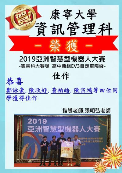 賀! 資訊管理科二年忠班陳欣妤等四位同學獲得2019亞洲智慧型機器人大賽佳作