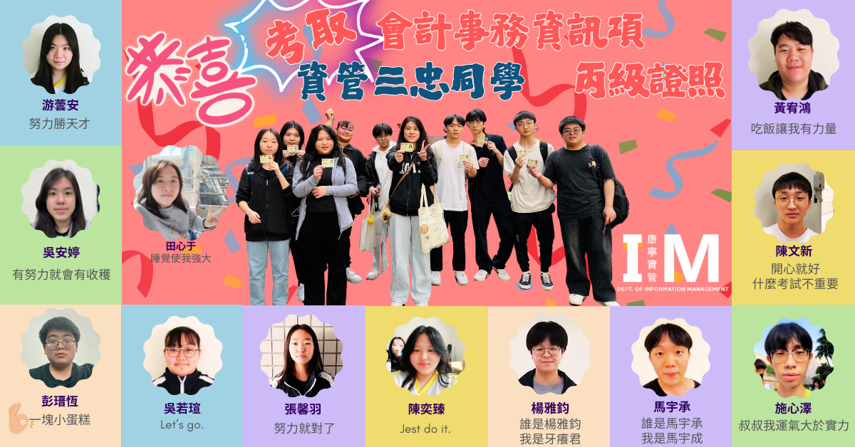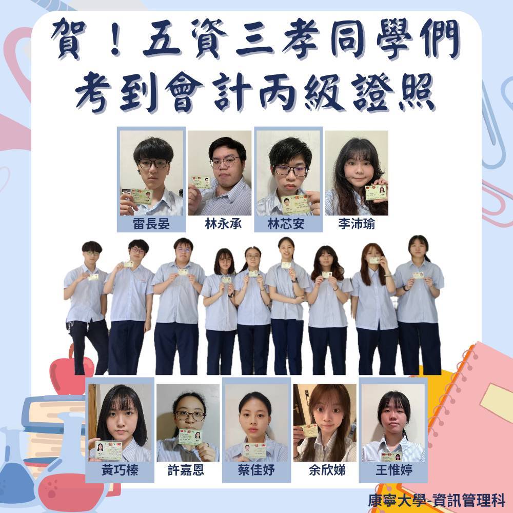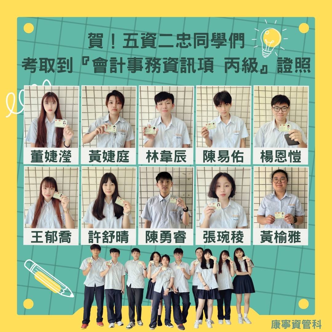 本校資訊管理科二忠黃榆雅等10位同學、二孝黃袖雅等10位同學、三忠吳安婷等11位同學、三孝黃巧榛等9位同學,參加中華民國技術士技能檢定,全數同學均順利取得勞動部發證之「會計事務資訊項-丙級證照」。