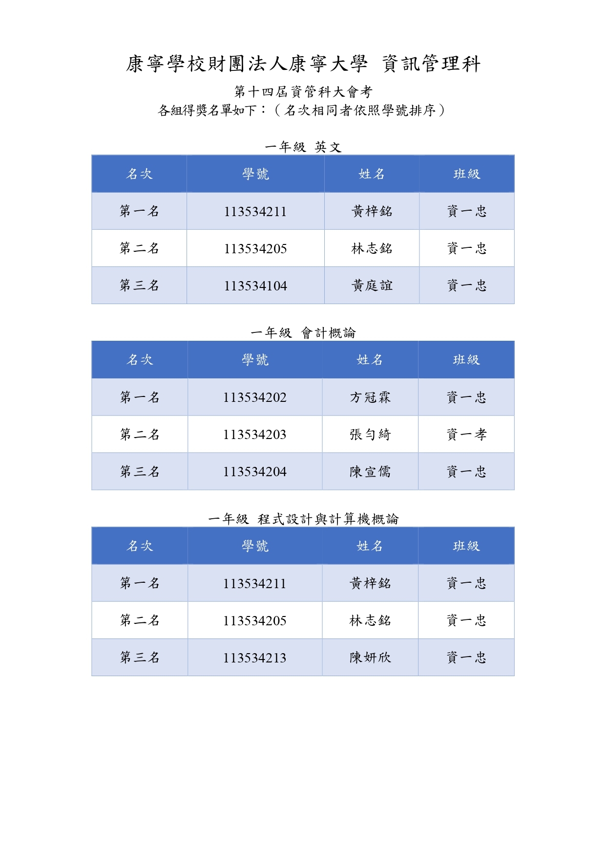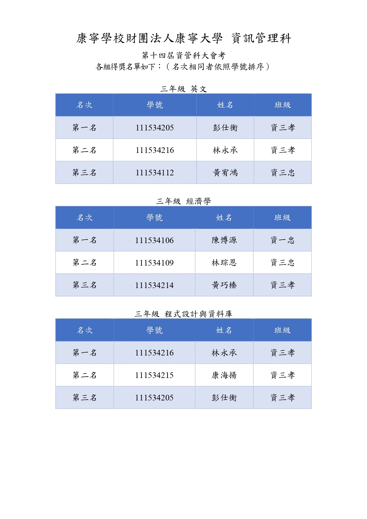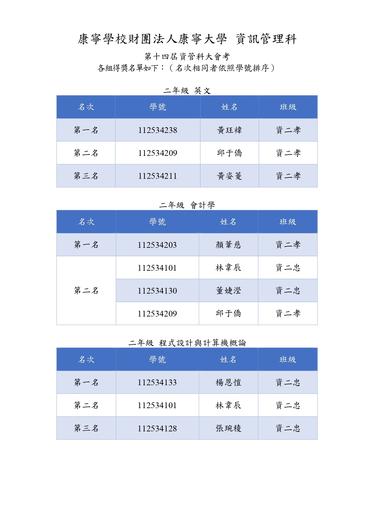 資訊管理科,第十四屆大會考競賽得獎名單出來囉🎉